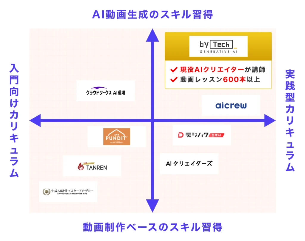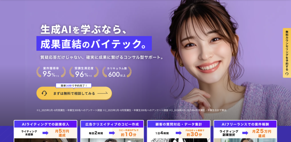 動画生成AIを体系的に学びたい人には、バイテック生成AIの『AI動画クリエイターコース』が最適です。バイテック生成AIは、生成AIに特化したオンラインスクールとして、最短4ヶ月で動画生成AIを活用したプロのAI動画クリエイターを目指せる構成になっています。